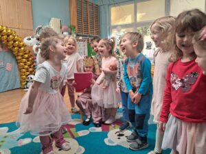 Dzieci z grupy Pandy spisały się na medal, dbając o to, by ten dzień był dla jubilatki niezapomniany. Było mnóstwo uśmiechów, radosne „Sto lat” zaśpiewane z całego serca oraz cała lawina pięknych życzeń.