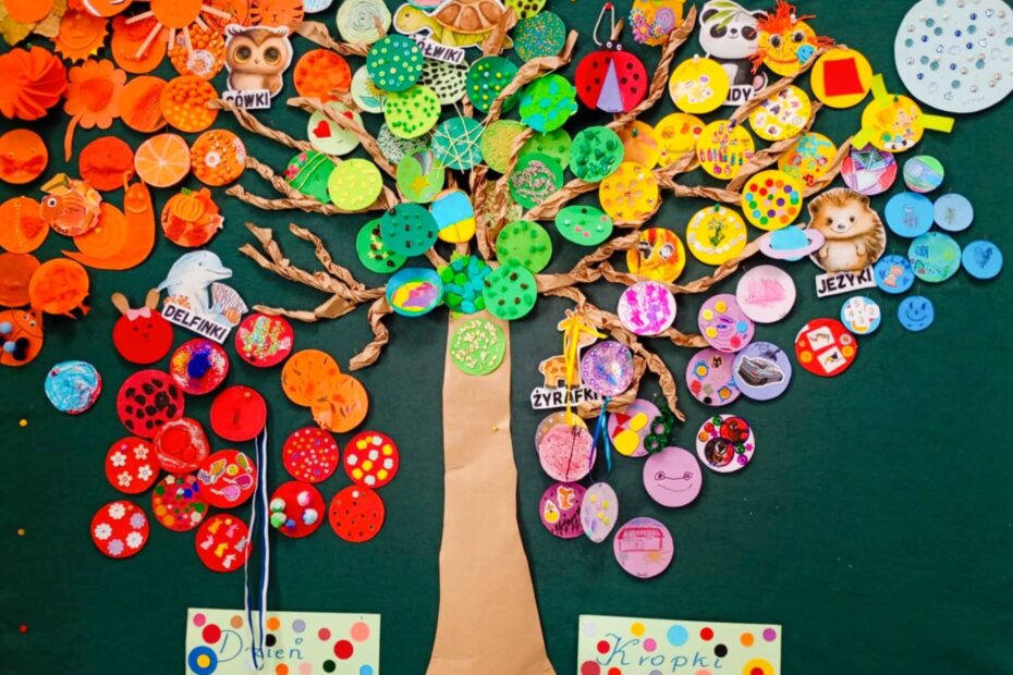 W poniedziałek 15.09.25 obchodziliśmy w przedszkolu Dzień Kropki. Dzięki włączeniu się Rodziców w naszą kropkową akcję powstało piękne drzewo, którego kolorowymi listkami były ozdobione przez dzieci kropeczki.